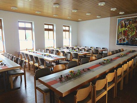Im Jugend- und Gemeindehaus befindet sich im Erdgeschoss der große Gemeindesaal für Veranstaltungen aller Art. In dem Raum ist Platz für bis zu 80 Personen.